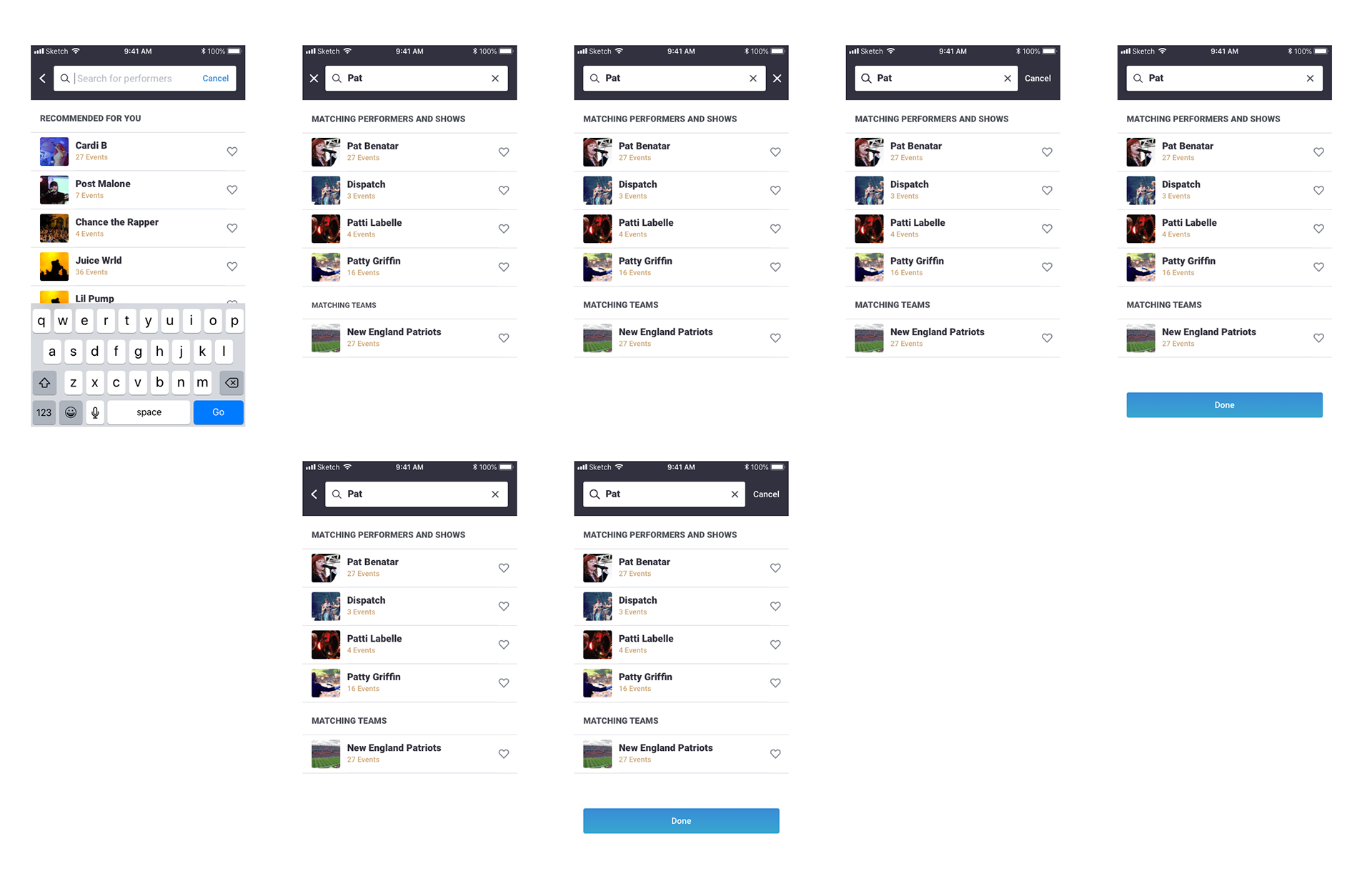 Tapping into the search bar on either tab will open up a single search header. We show recommendations to get the user started before anything is typed. We use an instant typeahead search that populates results as the user types. Although all matching performer results will be returned, we separate by the top level sports/performer categories in two lists so it's easier to find results. As the core action is adding a Favorite, I used a large hit state where tapping anywhere on the row will add that performer as a favorite. Users can use the "Cancel" button in the empty search bar or the "Done" button under the results to exit the Search view back to the Manage view.
