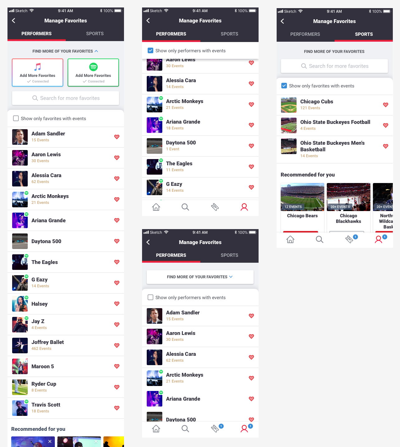 Up to this point, when users were viewing an artist or team, they could favorite that performer. We wanted to add a management section in the app for a centralized place for users to view, add and remove favorite performers. By investing in this management section, we hoped to support ways to recommend favorites and increase the ease of finding and adding favorites.