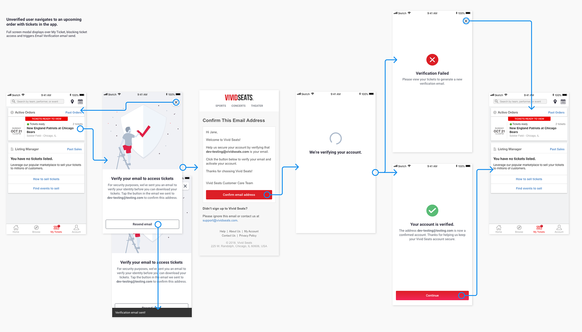 Collaborating with product and engineering, we mapped out the different scenarios of verification and I created user flows for each of those. That exercise informed which screens and interactions were needed. I then designed those views for app, mobile web and desktop in Sketch and dropped them into the journey map.
