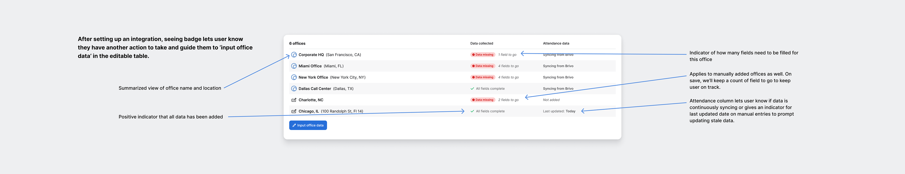 2. Integration layer on the data upload table: Displaying active integrations directly on the data upload interface. This method provided context for integration while users viewed or added office data but posed challenges for initial connection prompts.
